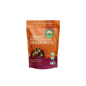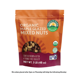 Tierra Farm has taken its award-winning blend of mixed nuts, certified-organic cashews, almonds, hazelnuts, pecans, and walnuts and gently coated them with our distinctive wheat-free tamari, and then lightly glazed them with the Northeast’s finest grade-A maple syrup. Bring this mixture to any party and everyone will be asking who brought this amazing snack. The answer is someone who happens to be nuts about nuts. Nibbled, gobbled or munched, Maple Glazed Mixed Nuts are a sweet and slightly salty sensational mix.