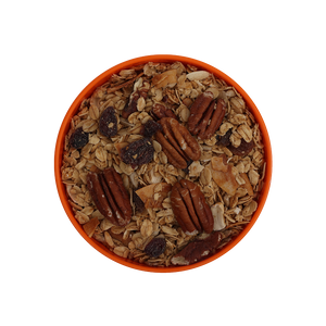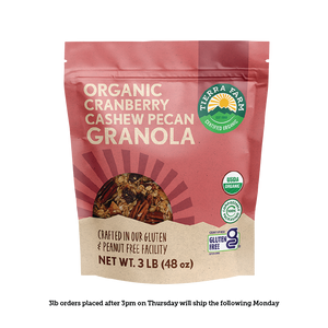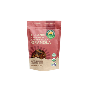 We produce our granola with gluten-free rolled oats in a peanut-free facility, free of any refined sugars, and tossed gently in near-by sourced organic maple syrup for a light, sweet taste. What really distinguishes this granola is the addition of buttery pecans and cashews balanced by the tangy, sweet taste of our juice-infused dried cranberries. This granola is a staff favorite and one of our most popular varieties. We recommend you try it with some Greek yogurt and bananas.