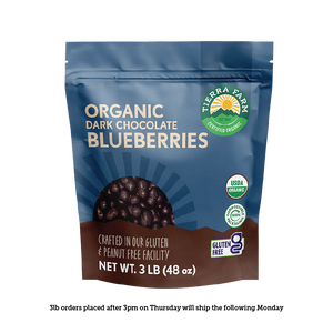 Fine Italian dark chocolate covers our beautiful organic blueberries. All products at Tierra Farm are certified Organic and Gluten Free and always hand crafted in our 100% Peanut Free facility. The certified Organic and Fair Trade dark 70% chocolate used to coat these amazingly tasty organic blueberries pairs perfectly with a glass of red wine or crisp sparkling water. Enjoy them with friends or indulge privately, either way they're fantastic!