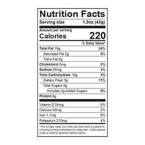 Organic Walnuts, Organic Pecans, Organic Cashews, Organic Almonds, Organic Pumpkin Seeds, Organic Sunflower Seeds, Organic Almond Flour, Organic Maple Syrup, Sea Salt.
