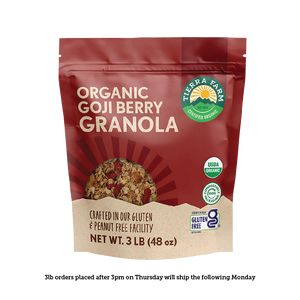 At Tierra Farm, we always choose the highest-quality ingredients we can find and blend them together using whole foods. Our Goji Berry Granola is a great example of that philosophy, baked with coconut oil and chock-full of almonds, sunflower, flax and chia seeds, but absolutely no refined sugars. Nuts and seeds lend energy and our rich goji berries and raisins offer antioxidants and vitamin C. These tart but sweet, chewy superfoods also boost the nutritional profile, making for an awesome breakfast treat or a great companion to any yogurt or kefir.