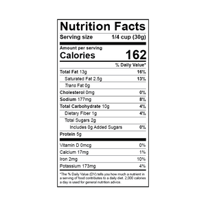 Dry Roasted Organic Cashews, Organic Dill Weed, Sea Salt, Organic Garlic Powder, Organic Onion Powder, Organic Coriander, Organic Chili Jalapeño, Organic Black Pepper, Organic Yellow Mustard Powder.
