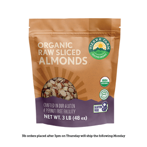Organic Almonds are one of nature’s finest creations. Endless versatility, crisp texture, mild sweetness, and extensive health benefits make them an indispensable part of your day. Almonds are a good source of protein and fiber making them the perfect mid-afternoon or mid-morning snack to help keep you energized until your next meal. Almonds are also high in magnesium, riboflavin, Vitamin E, and calcium, with unsaturated fats to help sustain a healthy heart. Whether you're striving to lose weight, manage blood sugar or simply get more natural nutrients every day, almonds help you get more of the good things your body needs. Tierra Farm sources the finest Organic Almonds from California to ensure they are a staple in your healthy diet.