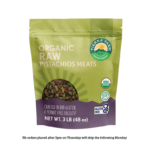 Loved by adults and children alike, Organic Pistachios are a versatile nut that is sure to please. Tierra Farm sources raw, Organic Pistachios in the shell, and raw, shelled Organic Pistachios (meats) from some of the best organic pistachio farms on the West Coast. Enliven any dish or try roasting them yourself. Pistachios are a good source of protein, fiber, and heart-healthy fats.
